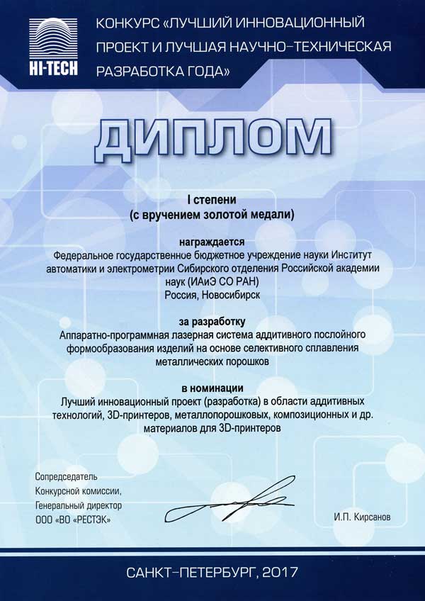 20.03.2017 XXIII Международная выставка-конгресс «Высокие технологии. Инновации. Инвестиции» (НI-ТЕСН 2017)14–16 марта 2017 г., Санкт-Петербург, Россия ИАиЭ СО РАН принял участие в XXIII Международной выставке-конгрессе «Высокие технологии. Инновации. Инвестиции» (НI-ТЕСН 2017), проходившей в рамках Петербургской технической ярмарки. В этом году в Конкурсе «Лучший инновационный проект и лучшая научно-техническая разработка года» от Института приняли участие 3 проекта, все они стали лауреатами Петербургской технической ярмарки и награждены: Золотой медалью и Дипломом I степени — разработка «Аппаратно-программная лазерная система аддитивного послойного формообразования изделий на основе селективного сплавления металлических порошков» (Лаборатория лазерной графики, зав. лабораторией В.П. Бессмельцев) в номинации «Лучший инновационный проект (разработка) в области аддитивных технологий, 3D-принтеров, металлопорошковых, композиционных и др. материалов для 3D-принтеров»; Золотой медалью и Дипломом I степени — разработка «Система бесконтактного кардиомониторинга» (Лаборатория лазерной графики, зав. лабораторией В.П. Бессмельцев) в номинации «Лучший инновационный проект (разработка) в области медицины, санитарии, профилактики, здорового образа жизни, медицинской техники,искусственных органов чувств, имплантов и протезов, предметов личной гигиены»; Золотой медалью и Дипломом I степени — разработка «Многоканальная система отображения и регистрации аудиовизуальной информации (СОРАВИ)» (Лаборатория синтезирующих систем визуализации, зав. лабораторией Б.С. Долговесов, совместно с Лабораторией программных систем машинной графики, зав. лабораторией Лаврентьев М.М.) в номинации «Лучший инновационный проект (разработка) в области передовых информационных технологий, цифрового проектирования и моделирования, мультидисциплинарных и кроссотраслевых технологий, компьютерных технологий оптимизации, суперкомпьютерных технологий, высокопроизводительных вычислений, виртуальных испытательных полигонов, тренажёров, манекенов». ПОЗДРАВЛЯЕМ!