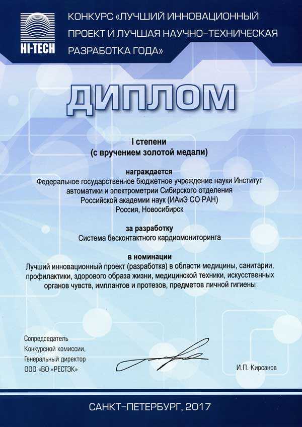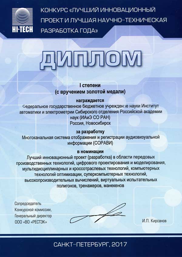 Дополнительно по теме: Разработки Института автоматики и электрометрии СО РАН получили золотые медали на выставке высоких технологий НI-ТЕСН 2017 – Новости сибирской науки (sib-science.info), Новосибирск, 21 марта 2017. Разработки ИАиЭ СО РАН получили золотые медали на выставке высоких технологий НI-ТЕСН 2017 в Санкт-Петербурге – Новости СО РАН (sbras.ru), Новосибирск, 22 марта 2017. Разработки ИАиЭ СО РАН получили золотые медали на выставке высоких технологий НI-ТЕСН 2017 в Санкт-Петербурге – Объединенный ученый совет СО РАН по нанотехнологиям и информационным технологиям (ousnano.sbras.ru), Новосибирск, 22 марта 2017. Три золота за инновации — Навигатор (navigato.ru), Новосибирск, 22 марта 2017. Разработки ИАиЭ стали лауреатами на выставке высоких технологий HI-TECH — Infopro54.ru, Новосибирск, 22 марта 2017.