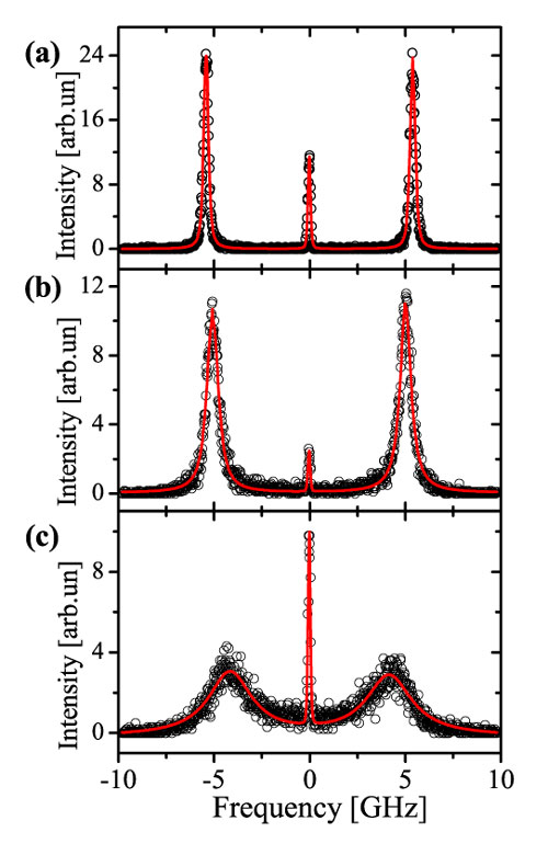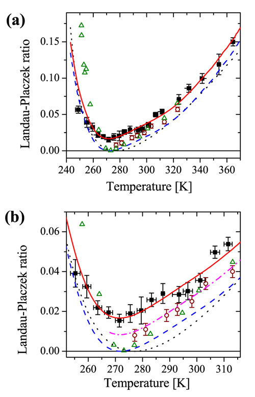 Рис. 1. Кластеры и свободные молекулы в воде (Модель предложена G. Nemethy, H.A. Scheraga) Структурная кинетика выглядит так: при повышенных температурах равновесие в воде смещено в сторону доминирования ассоциатов с нарушенными водородными связями, в то время как льдоподобные кластеры преобладают при низких температурах. Гипотеза о том, что водная структура содержит два структурных мотива, очень удобна для объяснения специфических свойств воды и поэтому популярна для интерпретации экспериментальных результатов. Но так ли это? Если изучать упруго рассеянный водой свет, то можно узнать, однородна или неоднородна жидкость. Обычно формула Ландау – Плачека, являющаяся отношением интегральной интенсивности упруго рассеянного света (пик Рэлея) к интенсивности двух линий Бриллюэна, связанных с рассеянием на звуковых волнах, является мерой в таких экспериментах. Рис. 2. Пик Релея и Бриллюэновские линии в воде при трех характерных температурах: T = 324 K (a), T = 272 K (b), T = 249 K (c). Отношение Ландау – Плачека для однородных низковязких жидкостей хорошо описывается классическим теоретическим выражением, в котором используется пара независимых термодинамических переменных. Появление неоднородной структуры должно приводить к дополнительному количеству упруго рассеянного света по аналогии с влиянием флуктуаций концентрации в бинарных растворах. В литературе известно всего несколько работ по определению отношения Ландау – Плачека в воде [2, 3]. Они выполнены давно и на аппаратуре ненадлежащего качества. В экспериментах сотрудников лаборатории спектроскопии конденсированных сред ИАиЭ СО РАН отношение Ландау – Плачека измерено для жидкого состояния воды с помощью 6‑проходного интерферометра Фабри – Перо. Ученые расширили диапазон температуры вверх и значительно скорректировали ранее сообщавшиеся сведения для переохлажденных состояний. Высокое спектральное разрешение аппаратуры исключило неоднозначность при оценке интенсивности пика Рэлея и линий Бриллюэна. Эксперименты показали, что зависящая от температуры часть отношения Ландау – Плачека хорошо описывается теоретическим выражением, в котором использована пара независимых термодинамических переменных (давление и энтропия). Рис. 3. Температурная зависимость отношения Ландау – Плачека для воды. Квадратами обозначены экспериментальные значения, полученные в данной работе; кружками – из [2]; треугольниками – из [3]. На рис. 3, (а) приведен весь температурный диапазон; на рис. 3, (b) – вблизи минимума. Линии соответствуют разным модельным предположениям. Красная сплошная линия показывает, как зависящая от температуры часть отношения Ландау – Плачека описывается теоретическим выражением, в котором использована пара независимых термодинамических переменных (давление и энтропия). Экспериментальные данные, полученные учеными ИАиЭ СО РАН, согласуются с теорией во всем изученном температурном диапазоне. «Эксперименты привели к неожиданному результату и показали, что никаких свидетельств увеличения упруго рассеянного света при низких температурах нет. Как же так? Данные проведенного исследования предполагают, что структура воды однородна, и ограничивают возможности свободного фантазирования относительно моделей структуры воды» – пояснил один из авторов работы – д.ф.-м.н. В.К. Малиновск