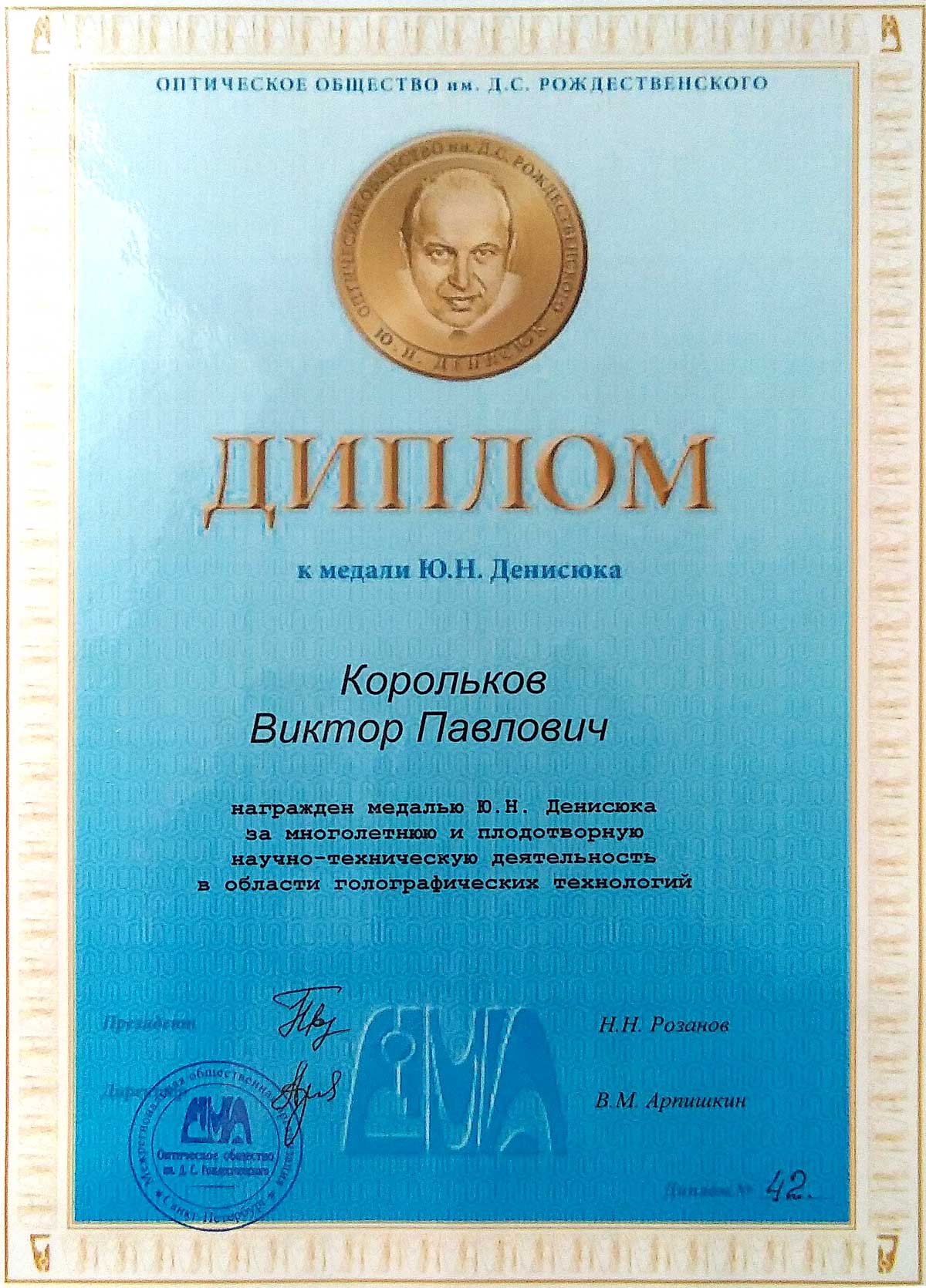 На пленарном заседании в первый день работы конференции медалью Ю.Н. Денисюка награждён зам. директора по научной работе ИАиЭ СО РАН, д.т.н. В.П. Корольков за многолетнюю и плодотворную научно-техническую деятельность в области голографических технологий.
