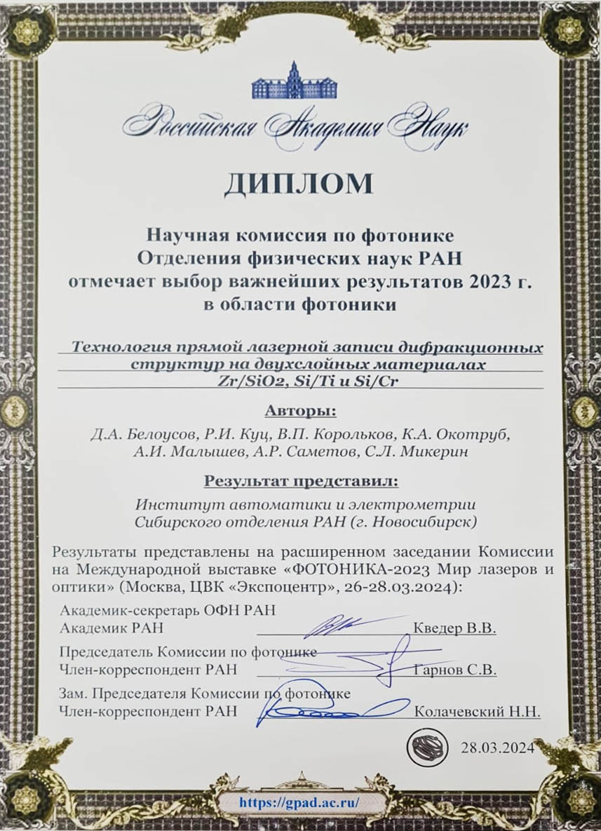 Работу авторов отметила дипломом научная комиссия по фотонике Отделения физических наук РАН как один из важнейших результатов в области фотоники в 2023 году.