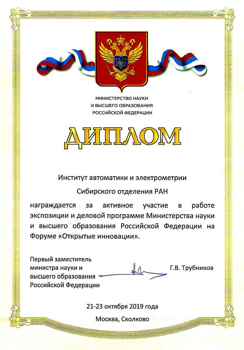 Итоги30.10.2019 ИАиЭ СО РАН принял участие в Московском международном форуме инновационного развития «Открытые инновации – 2019»Москва, Сколково, 21–23 октября 2019 г. Форум «Открытые инновации» – крупнейшее мероприятие в России в области новых технологий, технологического предпринимательства и перспектив международной кооперации в области инноваций. В рамках Форума проходили выставки Startup Expo, Startup Station, а также экспозиции отдельных компаний и организаций, в том числе объединённая экспозиция Министерства науки и высшего образования Российской Федерации. Кроме этого, параллельно выставке проходила конференция, доклады которой были поделены по следующим темам: «Цифровой человек», «Интеллектуальная экономика», «Технологии будущего». В работе официальной экспозиции и деловой программе Минобрнауки России приняли участие представители Министерства, научных и образовательных учреждений, научно-производственных предприятий и бизнес-структур, учёные и молодые исследователи, в том числе и представители Института автоматики и электрометрии СО РАН. Сотрудники ИАиЭ СО РАН помимо представления экспонатов, приняли участие в деловой программе Министерства науки и высшего образования – в работе круглого стола «Передовые цифровые, интеллектуальные производственные технологии, роботизированные системы» с докладами по своим тематикам: Вольф Алексей, м.н.с. (лаборатория волоконной оптики) – «Разработка сенсорных систем на основе волоконно-оптических датчиков для применения в композитных материалах для авиакосмических технологий», Хомутов Владимир, м.н.с. (лаборатории дифракционной оптики) – «Прецизионная цифровая интерферометрическая система для контроля формы оптических поверхностей с применением компьютерно-синтезированных голограмм». Насибулов Андрей Мергазинович, помощник директора, представил доклад «Достижения ИАиЭ СО РАН в разработке интеллектуальных производственных технологий и автоматизированных систем управления» в рамках сессии «Исследования и разработки: лучшие практики». Стенд ИАиЭ СО РАН: слева – система опроса волоконно-оптических датчиков встроенных в композитные материалы, справа – прецизионная цифровая интерферометрическая система для контроля формы оптических поверхностей К разработкам Института проявлен значительный интерес, проведены предварительные переговоры с потенциальными партнёрами, в том числе: ПАО «Северсталь» (г. Череповец), МГТУ им. Н.Э. Баумана (Москва), ООО «СВД.Спарк» (г. Троицк), Центр робототехники СИП ТИУ (г. Тюмень), Международный союз приборостроителей и специалистов по информационным и телекомуникационным технологиям (Москва), FUELEMENT (Москва), ООО «Лазер оптикс дизайн» (Республика Беларусь, г. Минск), ГИПО (г. Казань) и другие. ИАиЭ СО РАН награждён дипломом за активное участие в работе экспозиции и деловой программе Министерства науки и высшего образования Российской Федерации на форуме «Открытые инновации». Слева – младший научный сотрудник лаборатории дифракционной оптики Владимир Хомутов, справа – младший научный сотрудник лаборатории волоконной оптики Алексей Вольф